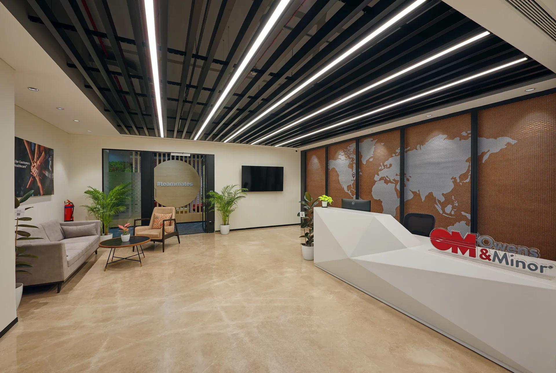 Owens & Minor's Pune workplace is designed as a vibrant, people-first environment that blends functionality with warmth. The space features collaborative lounges, focus pods, and open workstations infused with natural light and greenery, creating a refreshing and energetic atmosphere. A striking use of brand colors, accent graphics, and biophilic design elements ensures the workplace feels both engaging and inspiring for its diverse teams.