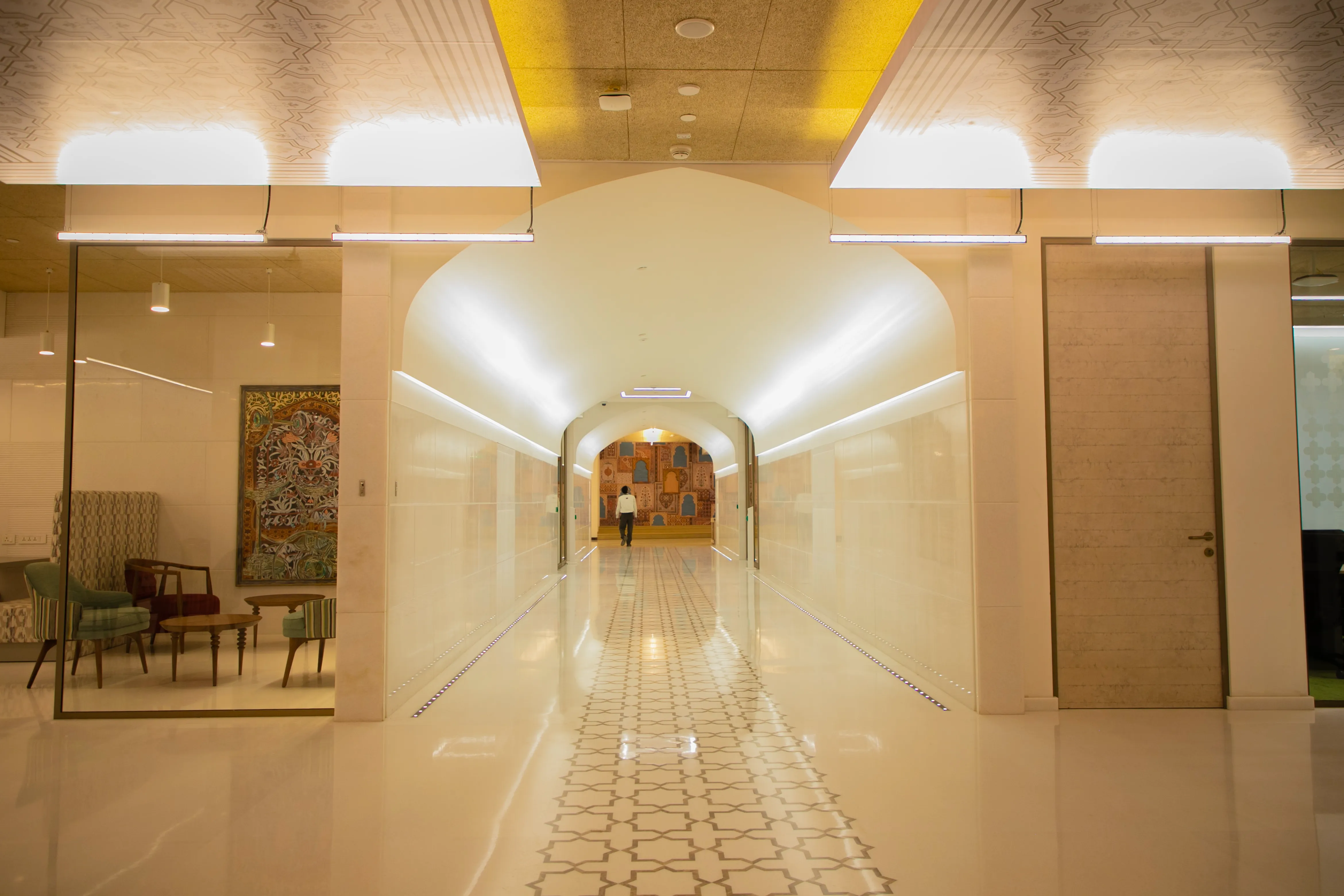 ANJ successfully delivered Microsoft's expansive 150,000 sq. ft. office in NCR, designed to reflect the company's global identity while embracing local character. The space is marked by precision detailing, immaculate finishes, and seamless spatial planning that blends functionality with elegance. The design highlights striking ceiling patterns, intricate inlays, and grand corridor perspectives, creating a sense of scale and sophistication befitting a global technology leader.